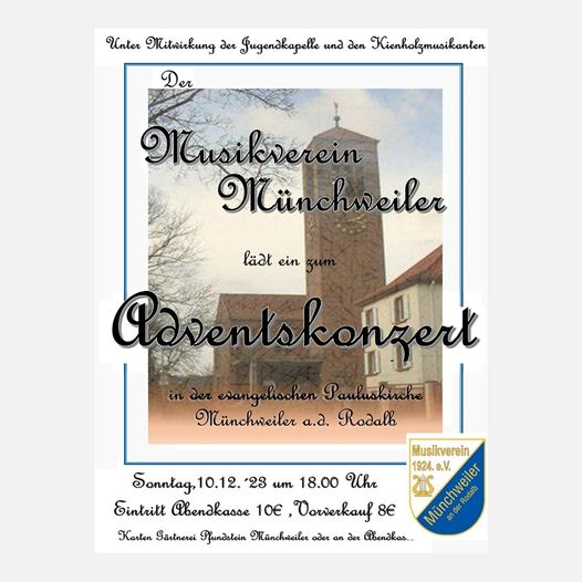 Adventskonzert des Musikverein Münchweiler am 10.12.2023 um 18.00 Uhr in der evangelischen Kirche in Münchweiler.
